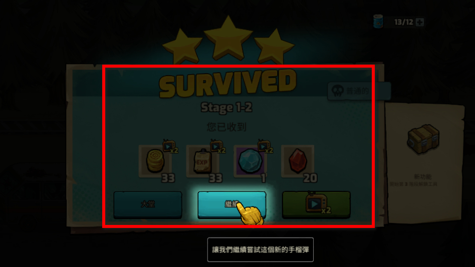 4、通關后可獲得金幣、經驗、寶石等獎勵,點擊繼續返回大廳,也可選擇觀看視頻獲取雙倍獎勵,積累資源。