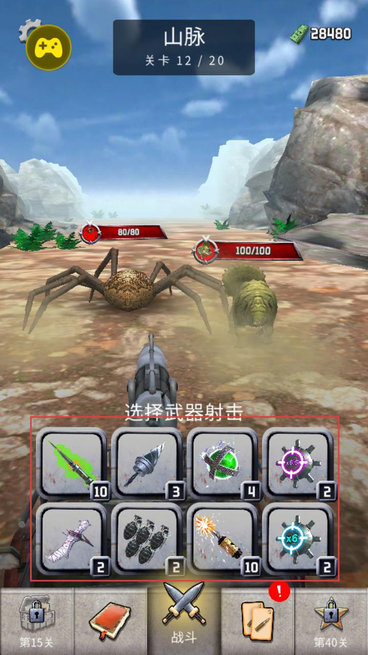 1、進入山脈關卡12,面對蜘蛛和爬行怪物,可從下方選擇多種武器,如綠色武器、鉆頭等,準備射擊怪物開啟戰斗。
