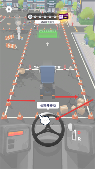 1、長按方向盤移動,操控卡車在關卡場景里行駛,躲避障礙物,完成駕駛挑戰,通過關卡。