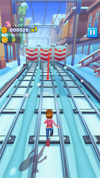 2、在冰雪軌道場景中持續向前奔跑,躲避前方的路障,積累分數如當前分數000026。