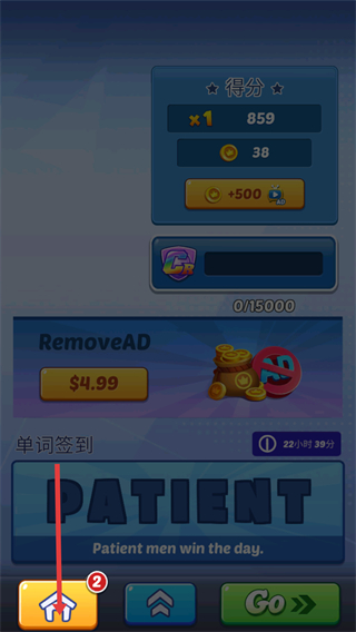 4、游戲結束后,可查看得分如859和金幣獎勵如38,點擊左下角房屋圖標返回主界面,參與單詞簽到等活動獲取額外獎勵。