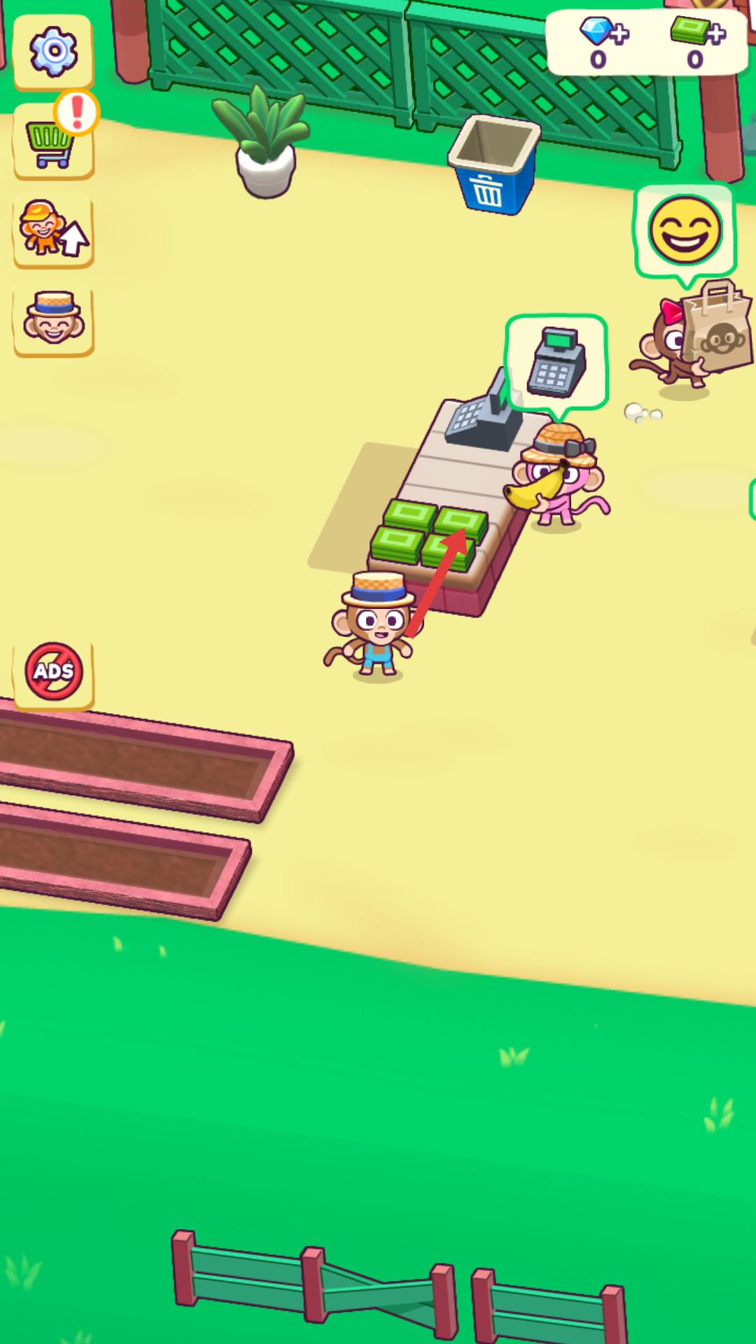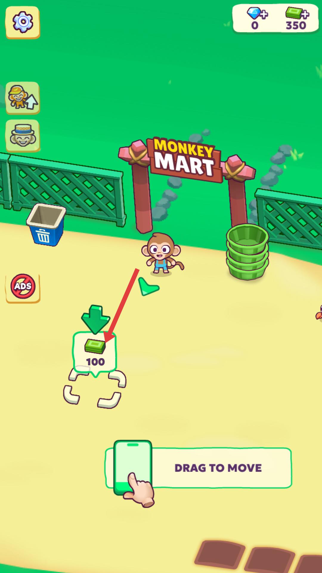 1、點擊獲取100現金,在MONKEYMART場景中開始經營,通過拖拽操作移動角色,開展各項經營活動。
