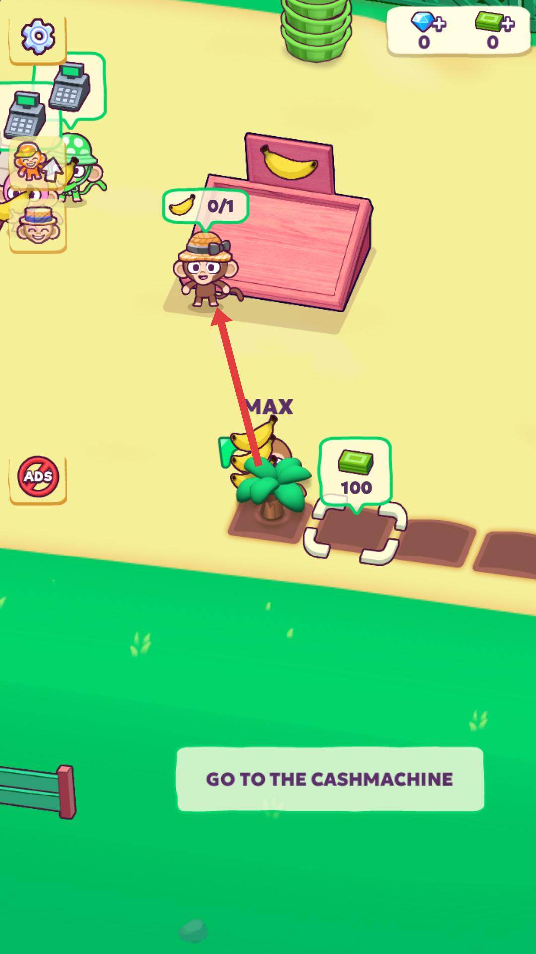 2、派遣猴子在香蕉攤工作,完成1香蕉的收集任務,積累資源用于后續經營升級。