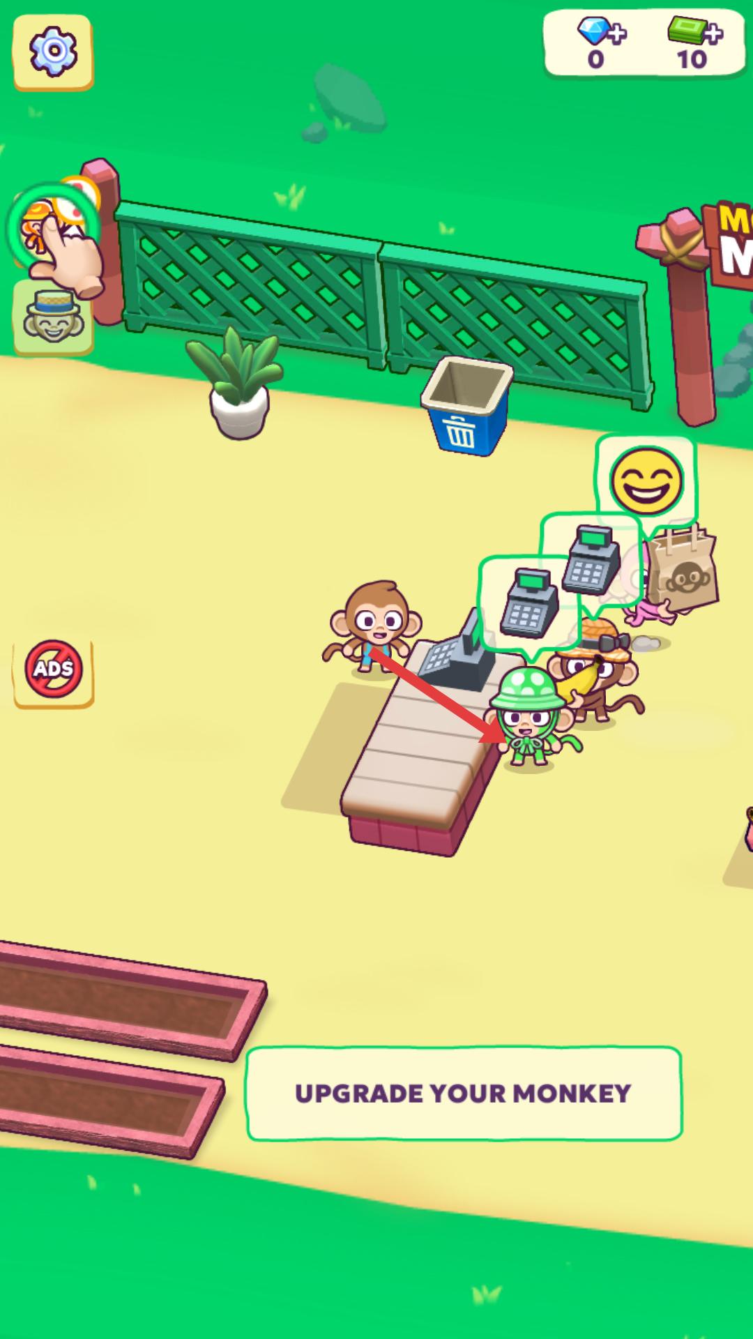 3、點擊升級猴子,解鎖不同裝扮和技能的猴子員工,提升經營效率,增加顧客滿意度如笑臉標識。