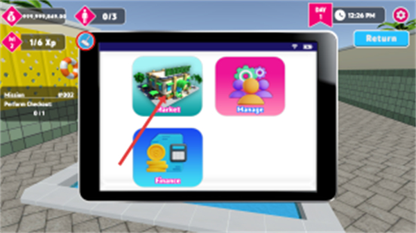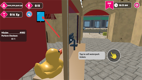 1、點擊墻上的平板,進入操作界面,開展Mission002PerformCheckout任務,學習購買游樂設施,提升樂園運營能力。
