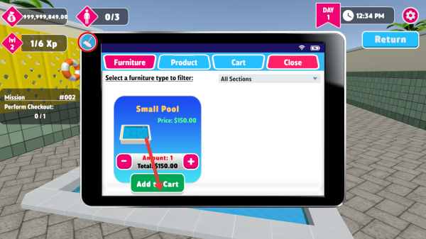 4、在平板的Furniture界面,選擇Pool加入購物車,花費150購買,推進水上設施建設,提升樂園吸引力。