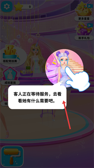 4、完成客人的穿搭服務后獲取積分和星星,積累資源用于解鎖更多服裝和發型推進游戲進程。