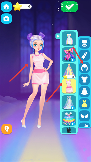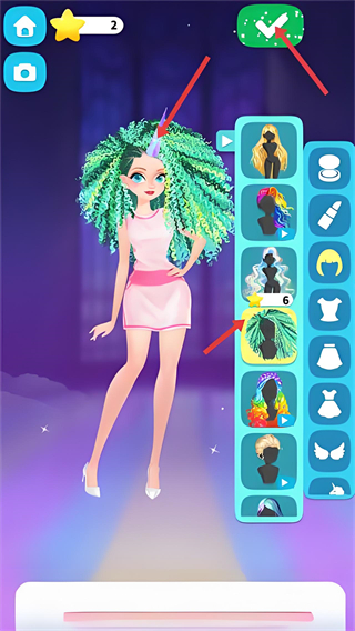 3、為客人選擇發型和裝飾從發型列表中挑選并佩戴,完善整體穿搭造型點擊確認完成搭配獲取星星獎勵。