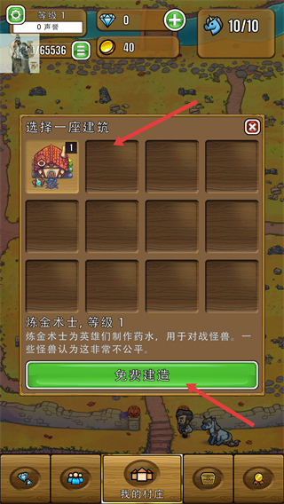 2、選擇煉金術士建筑點擊免費建造,為英雄制作藥水助力對戰怪獸提升村莊的戰斗支持能力。