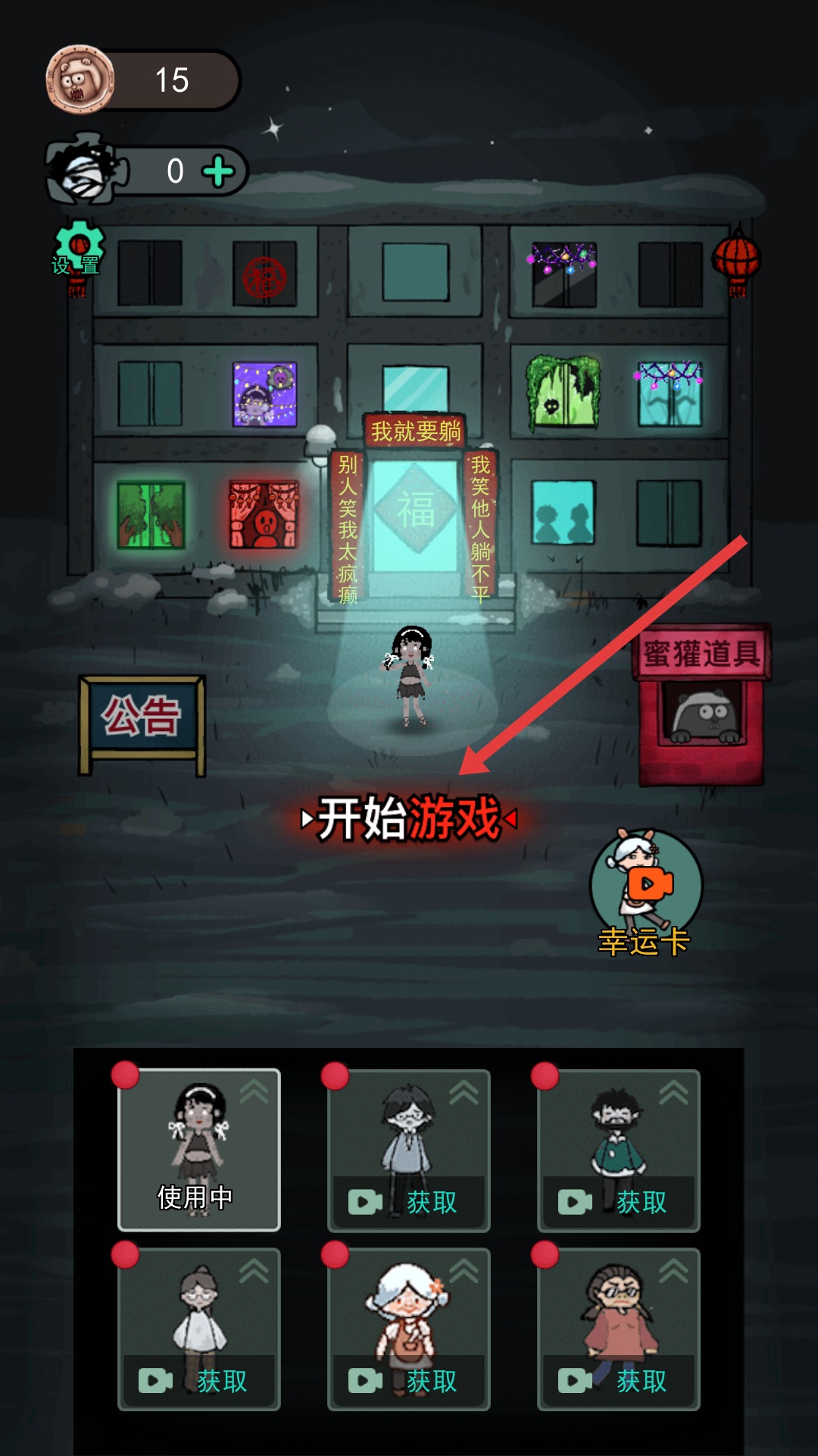 2、游戲主界面,點擊開始游戲,可選擇角色,進入游戲場景,開始躺平發育的游戲體驗。