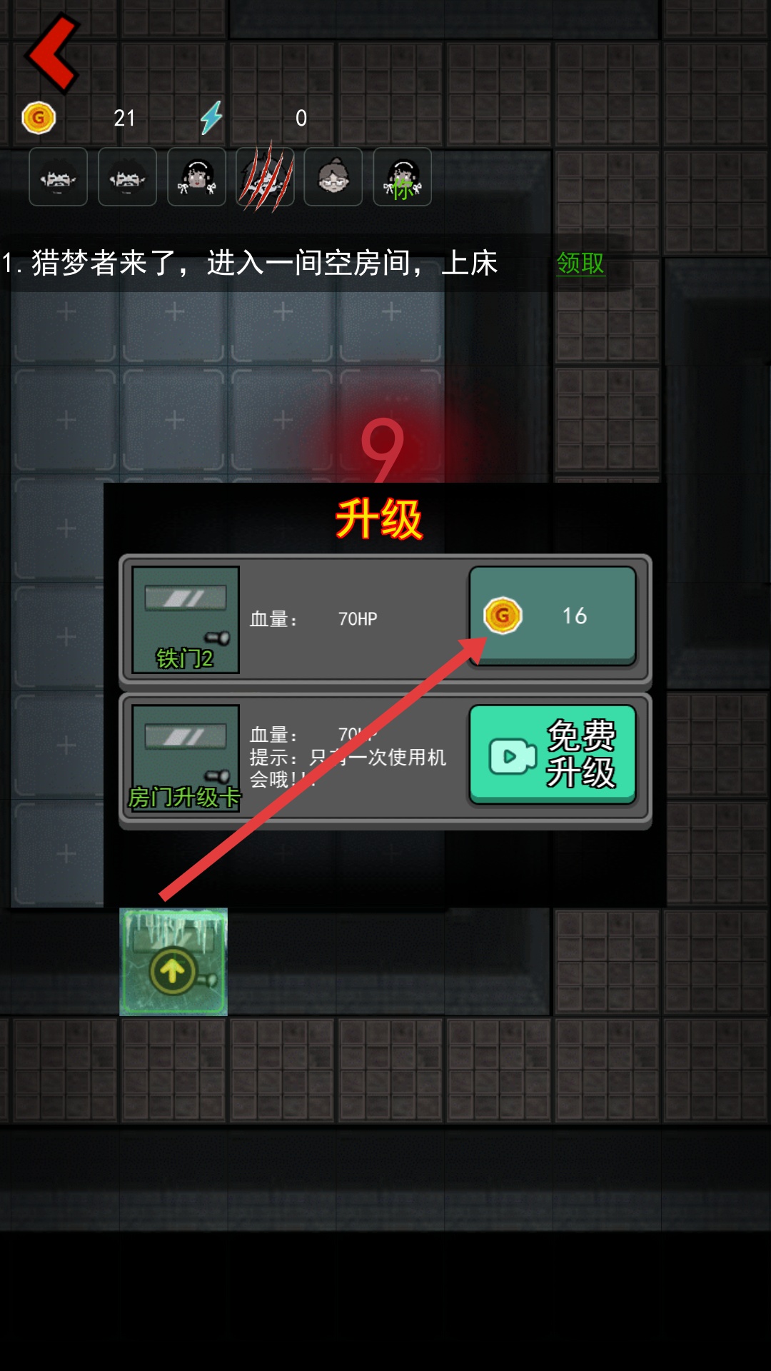4、進入游戲后,進入空房間上床,通過消耗金幣升級房門等設施,抵御獵夢者的攻擊,不斷發育成長。