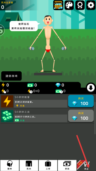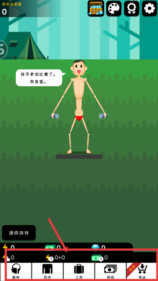 4、合理分配資源,優先升級核心肌肉部位,利用商店道具和成就獎勵,快速提升角色健身等級,解鎖更多游戲內容。