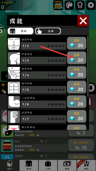3、完成成就中的肌肉等級任務如護肩等級,可獲取鉆石獎勵如20鉆石,積累資源用于后續養成。