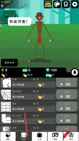 1、點擊肌肉選項,可查看并升級護肩、肱外肌、肱肌等肌肉部位,提升每分鐘能量獲取,增強角色健身能力。