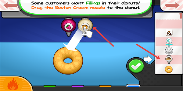 2、根據顧客需求,拖動對應的餡料噴嘴到甜甜圈上,為甜甜圈添加餡料。
