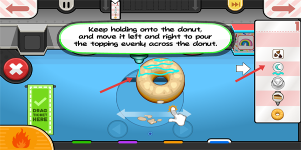 3、在添加配料時,保持對甜甜圈的控制,左右移動甜甜圈,使配料均勻地分布在甜甜圈上。