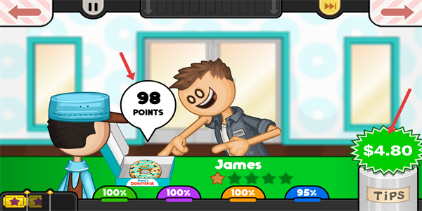 4、將制作好的甜甜圈交給顧客,獲得分數和金錢,不斷提升甜甜圈店的經營成果。