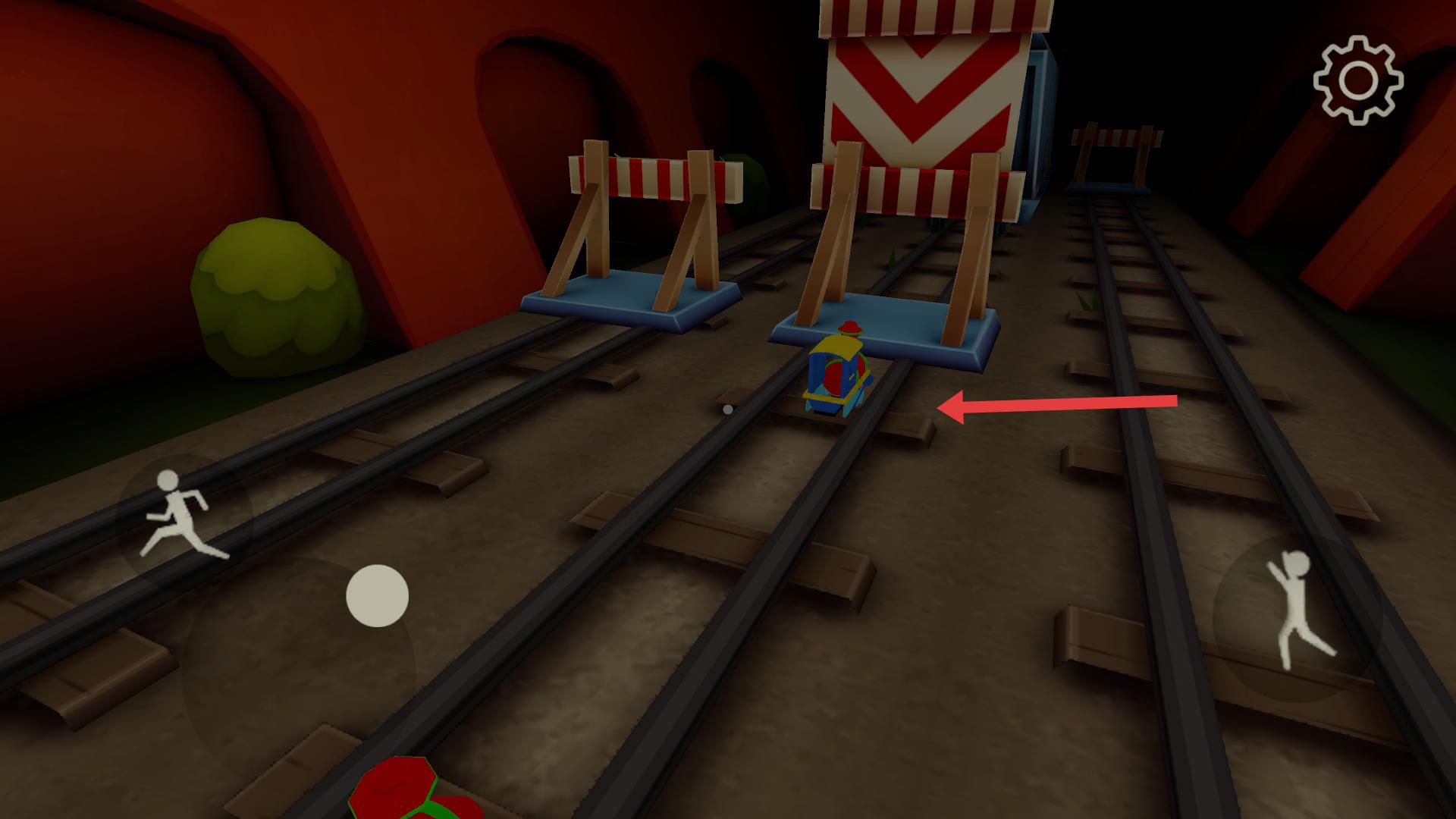1、當軌道上出現小型玩具火車時,留意箭頭提示,操控角色避開,繼續在軌道間穿梭前行,避免碰撞阻礙進程。