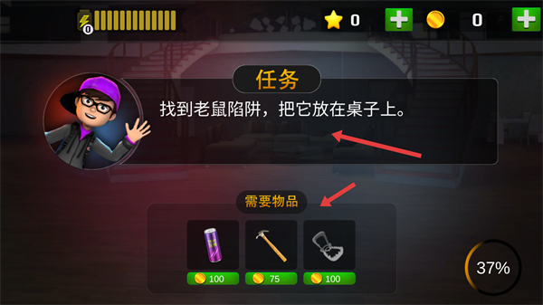 1、明確任務是找到老鼠陷阱并放在桌子上留意需要的物品準備收集電池、錘子和老鼠陷阱為完成任務做準備。