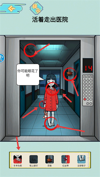 4、觀察電梯內的各種細節如手術傷疤、墻上腳印等,收集這些線索解開醫院的謎題推進離開醫院的進程。