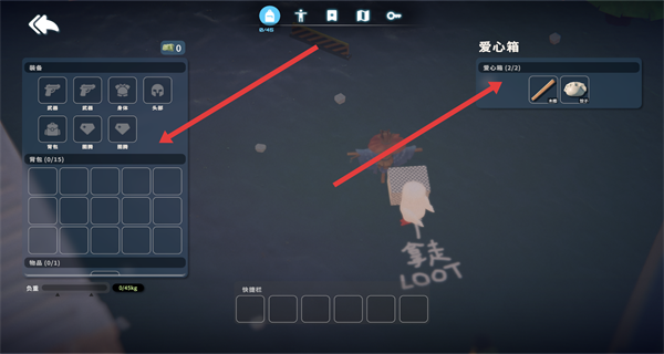 4、打開背包查愛心箱物品如工具材料點裝備欄穿戴武器防具,管理背包腰帶飾品合理分配道具空間。