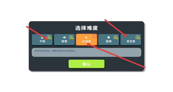 2、選擇難度選標準難等依實力選不難和微難超難,點確認進入體驗對應挑戰難度越高敵人越強。