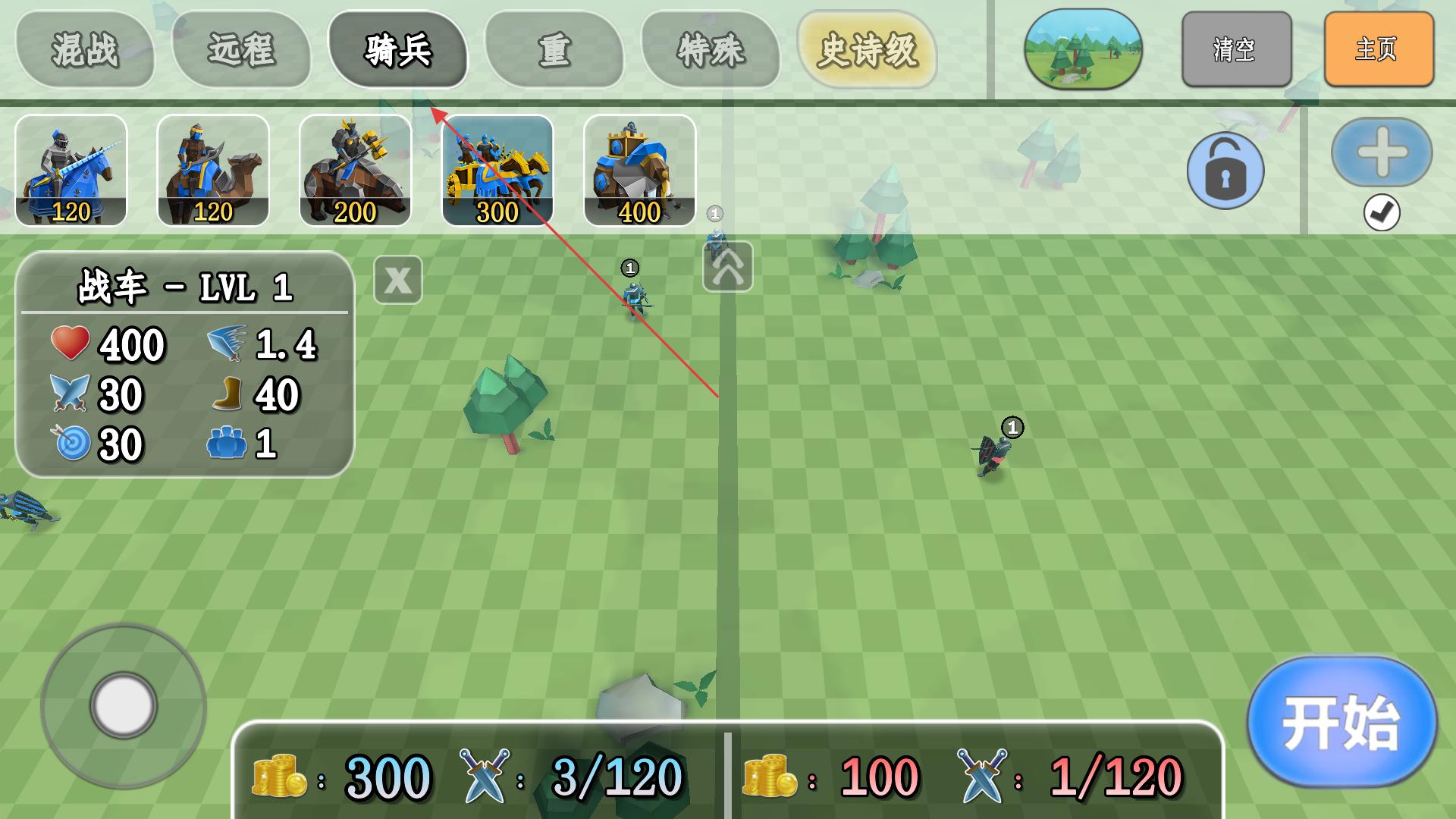 2、在關卡準備界面選擇騎兵類型單位,查看單位屬性,部署騎兵到戰場,為戰斗做好兵力準備。