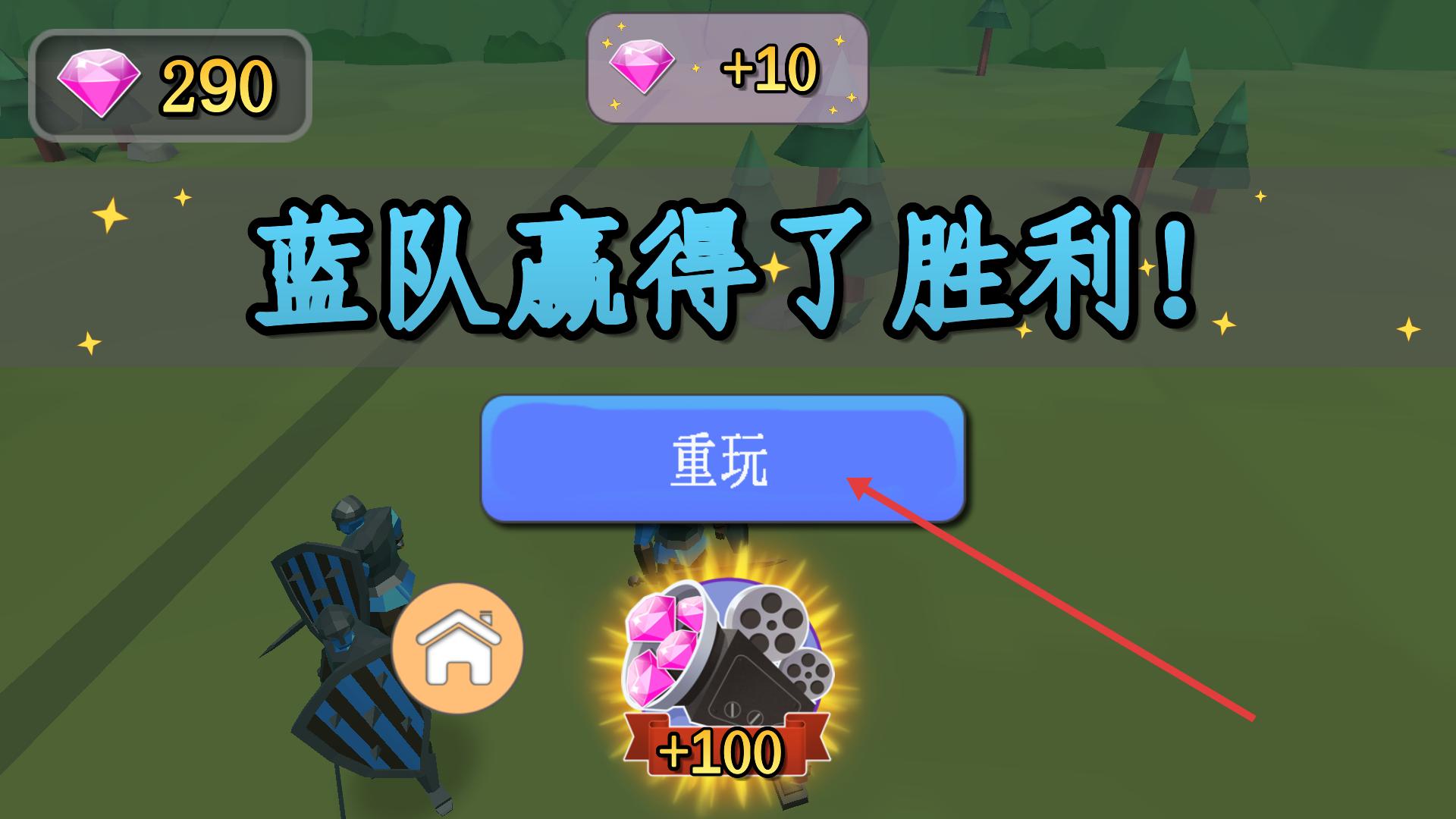 4、持續戰斗直至擊敗所有敵方單位,藍隊贏得勝利,獲取鉆石獎勵,點擊重玩或返回主頁,全面完成游戲的關卡選擇、騎兵部署與戰斗勝利流程。