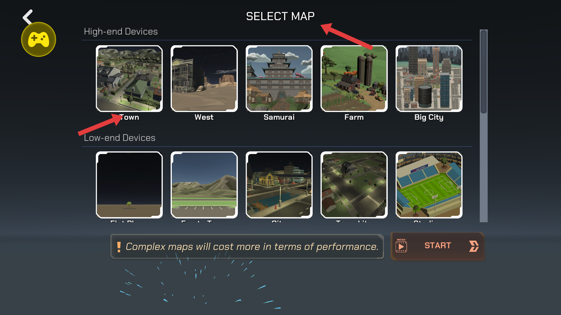 2、在地圖選擇界面,有Town等多種地圖,根據設備類型選擇對應地圖,選好后點擊START開始游戲。