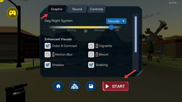 3、在設置界面,在Graphic里設置晝夜系統,視覺效果等,調整好后點擊START進入游戲。