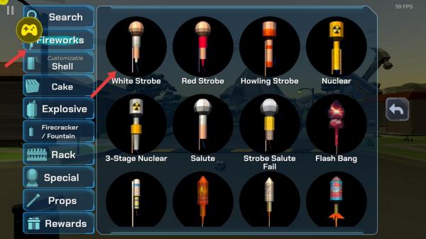 4、在煙花選擇界面,有Red Strobe等多種煙花類型,可從Fireworks分類中選擇喜歡的煙花,進行燃放體驗。