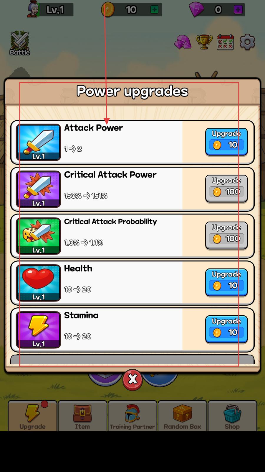 4、在戰斗勝利后,可使用獲得的金幣升級攻擊力、生命值、耐力等屬性,提升角色戰斗能力,為后續戰斗做好準備。
