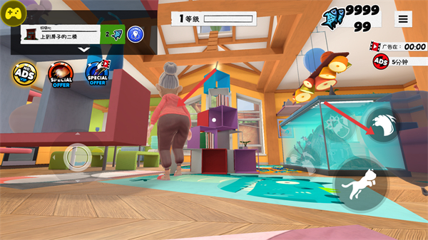 2、在房子里探索利用右側的攻擊按鈕互動完成上到二樓的任務,獲取魚的獎勵推進游戲進程提升等級。