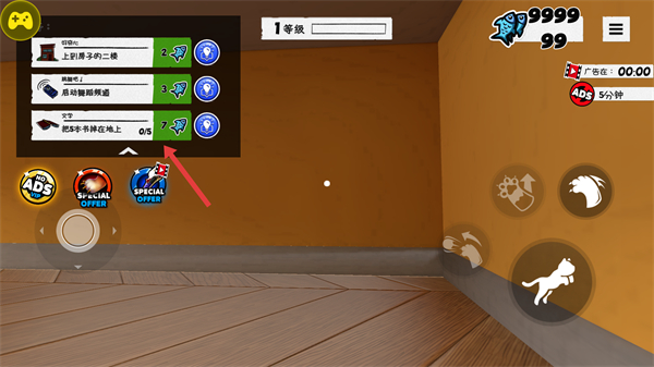 4、在房子里的不同區域探索留意可互動的物體,繼續完成任務獲取獎勵推進游戲的冒險進程體驗貓的趣味生活。