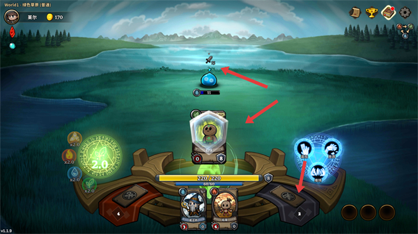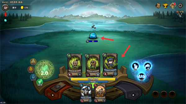 2、在綠色草原場景中利用手中的卡牌對戰藍色水滴怪物,合理選擇卡牌出戰推進戰斗進程獲取勝利。