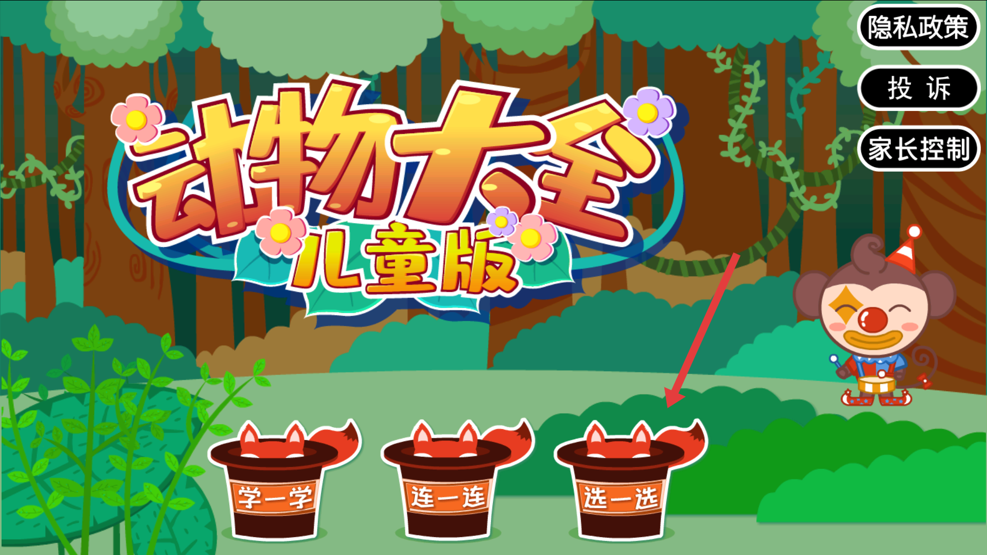 1、進入游戲可見帶有猴子、森林元素的標題界面,有學一學、連一連、選一選三種模式可選,可根據需求選擇開啟動物認知之旅。