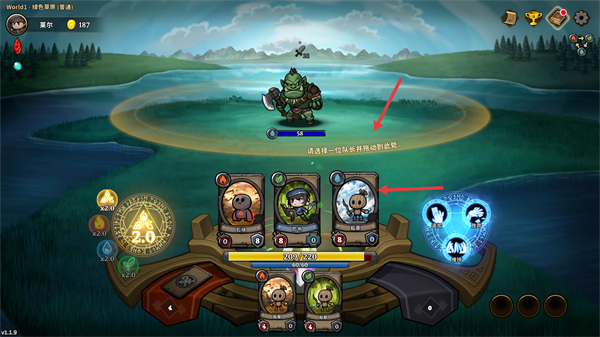 1、選擇一位隊長并拖動到指定位置開始與綠色獸人怪物的對戰,合理選擇隊長卡牌為戰斗勝利奠定基礎。