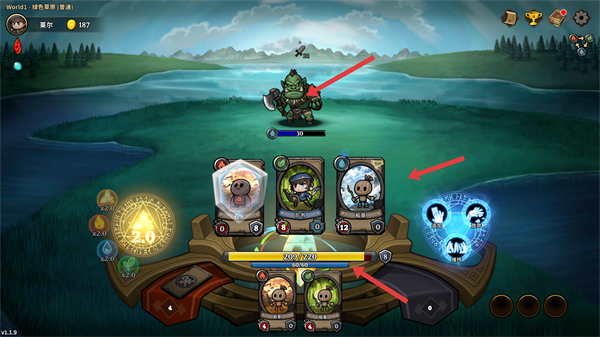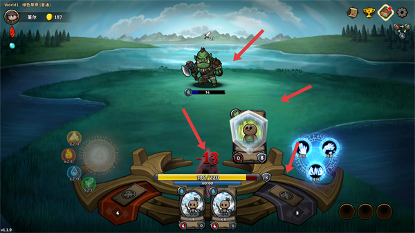 2、在戰斗中使用石塊等卡牌攻擊綠色獸人怪物消耗其生命值,留意自身和怪物的狀態調整卡牌策略推進戰斗進程。