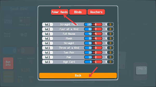 2、查看PokerHands面板了解不同撲克組合的得分等的分值,點擊Back返回為構建牌型策略提供依據。