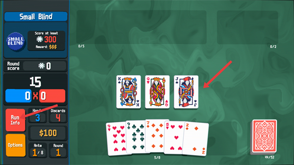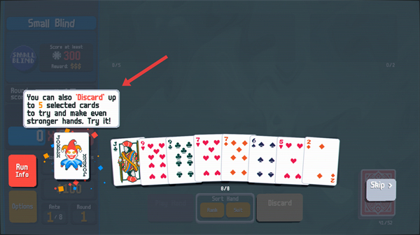 4、利用Joker牌最多可以選中的牌嘗試構建更強的牌型,提升得分按照提示操作優化手牌組合推進游戲進程。