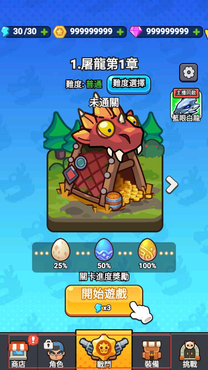 1、進入游戲選擇屠龍第1章關卡,難度可選普通,點擊開始游戲,開啟充滿挑戰的屠龍冒險之旅。