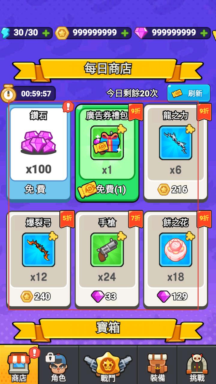 2、在每日商店可免費領取鉆石,還能購買廣告券禮包、龍之力、爆裂弓等道具武器,助力提升屠龍實力。