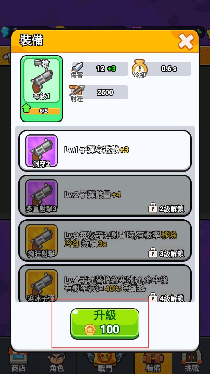 3、在裝備界面升級手槍,花費金幣提升傷害、冷卻、射程等屬性,還能解鎖子彈穿透數3、多重射擊等技能,增強武器戰力。