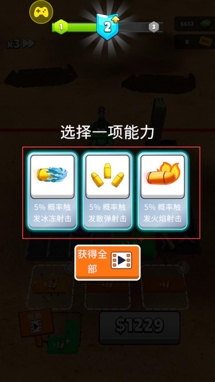 1、在能力選擇界面,可挑選冰凍射擊、散彈射擊或火焰射擊中的一項,提升塔炮攻擊效果,為抵御敵人進攻強化戰力。