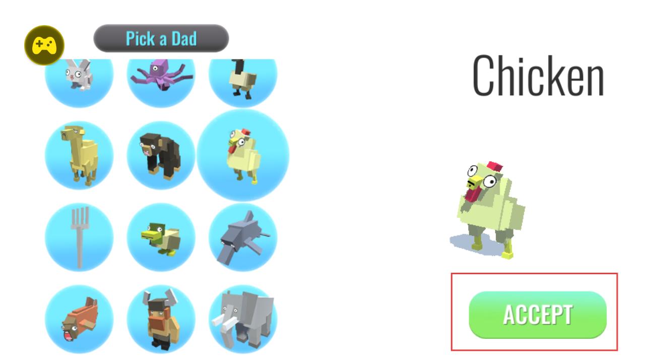 2、在Pick a Dad界面挑選父本動物,比如雞,點擊ACCEPT,進入下一步合成操作。
