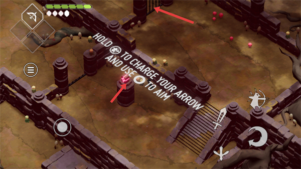 3、遇到帶有紅色標記的機關時,初始游戲會給出提示,如圖按照提示長按蓄力弓箭并瞄準,可激活機關打開通路。