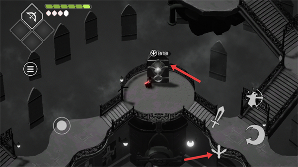 2、在場景中找到帶有enter標識的門,靠近后可進入新的區域,同時利用下方的技能按鍵,應對可能出現的敵人和機關。