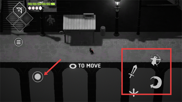 1、游戲中通過左側的虛擬搖桿移動角色,右側有弓箭、劍等技能按鍵,根據場景和敵人類型,選擇合適的技能進行戰斗和探索。