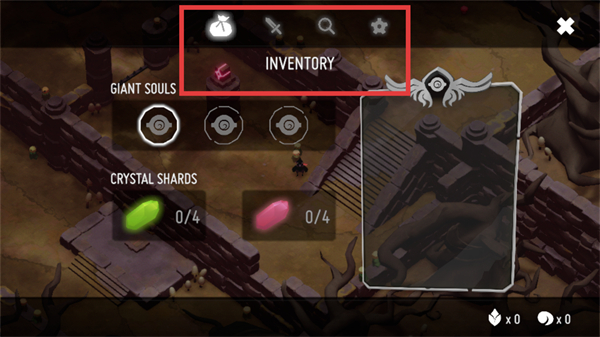 4、在游戲中打開inventory界面,可查看金幣、武器、搜索和設置等選項,方便管理游戲資源和進行相關設置。