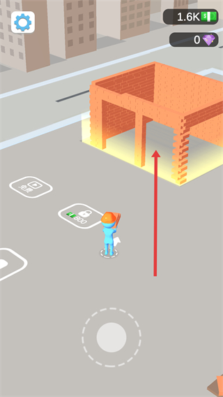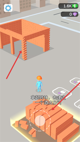 1、操控戴安全帽的角色拿起磚塊,前往指定建筑區域建造酒店房間,通過搬運磚塊逐步搭建起建筑的框架。